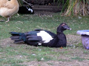 Well, I think old Leonardo (Muscovy drake) heard Stacy saying he probably wouldn’t make it through the winter because he wasn’t looking too good yesterday. He was walking around so slow it seemed it would take all day to cross the yard. And he was even slower at going through the gate than I am. Some obnoxious brown girlie ducks (chocolate Muscovies) showed up at the end of the summer for old Leonardo and his son, Brad, but they never even paid any attention to them. I think that’s why Hershey flew away yesterday. Cocoa has been sitting on the railing with Ding Dong, and they even all three flew onto the roof, but no one thought they’d be foolish enough to fly away! Hershey made it through the night, though, and showed up at the corn dish with the wild mallards in the morning. Stacy said she was going to clip their wings and I sure hope I get to help! I’ll chase them fall over the aviary to calm them down! That will get them nice and muddy. Then I’ll stand too close and try to get her attention by nipping her coat-tails. Yep, it will be a fine day for me to be a Big Help.