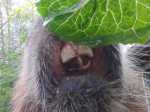For the next couple of weeks, the Farm Manager sliced all my food into bite-sized morsels and slipped them into my mouth past the gaping wound where my front teeth used to be. I passed the days eating soft clipped grass, lettuce, and crunchy milk. I couldn’t pick up anything with my mouth, and though my molars were fine, chewing with my strange new (lack of) dentition made my jaw sore, and after a few hand-fed bites, I worked my jaw back and forth and refused any more. She had found the second tooth and I was relieved to have the bloody relics displayed on her desk instead of tormenting my poor beat up mouth. I suffered through another day without pain meds then sent The Bartender out for more. I was on pain meds for a week. It was almost two weeks before I could open the kitchen door. By three weeks I had nearly given up on corn and potatoes, but was eating a bit of grass and lettuce and drinking milk. My eating and pooping started to approach normal volume a month later, but it took five weeks for my teeth to sharpen up enough to bite through corn husks.