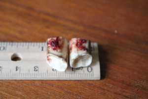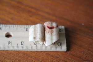 Partial upper incisor, with tissue, shortly after tooth loss. You can see that the front of the tooth (lower edge here) is clean, while the back (top edge) shows how the tissue had been the only thing holding my tooth on, for two days. The cutting edge is to the right, broken edge to the left.
