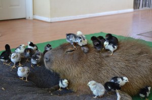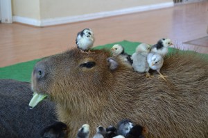 In the wild, capybaras let birds walk all over them to pick off the bugs and ticks. I watched this game in Panama and was amazed at how the wild capybaras pouffed up! When their fur sticks out, it’s called piloerection. That lets the bird beaks get way in there to pick out the bugs.