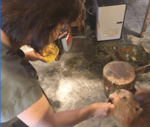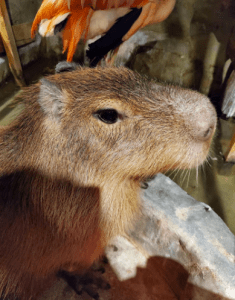 The capybara was eating hay and some lettuce or cabbage while Frank was there. He got to pet the capybara who was very gentle and tolerant of the attention though it must have been a stressful environment, as she was packed in with all the other animals. Frank didn’t see her interacting with the other animals but she seemed to not mind them. She ate, slept by the heater, and took a slow walk around the place.