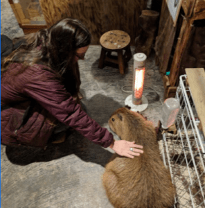 The whole place was filled with animals including owls, flamingos, and desert foxes. The animals were rescued from zoos and other cafes that couldn’t keep them anymore. Frank said the animals appeared healthy, considering how many animals there were in such a tight indoor space, but it was very clean and there was no odor. It looks decent enough to me and the capybara looks good. Dobby would have chewed the cord on that heater, so this is a nice capybara, not the naughty kind like I got.
