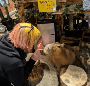 Frank was walking around Asakusa (a very touristy area in Tokyo) with his girlfriend, and they came across a young woman with an owl on her shoulder (wow, that had to hurt!) She was holding a sign advertising the cafe and when they saw that it had a capybara, they decided to check it out.