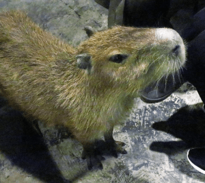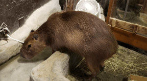 Japanese people are enamored of capybaras. Well, isn’t everyone? Of course we are. For some reason, here in the USA, we stop short of displaying them in cafes as entertainment. One of Dobby’s fans, we’ll call him Frank, visited Owl Cafe Asakusa. The capybara wandered about as he presumably drank tea and ate cookies. He also took some photos which he generously shared with me. I have reservations about capybaras being kept indoors in unnatural settings, but this one is presumably a rescue, and there are certainly worse situations than this cafe. Capybaras are quick to express their displeasure, and this one seems happy to receive attention.