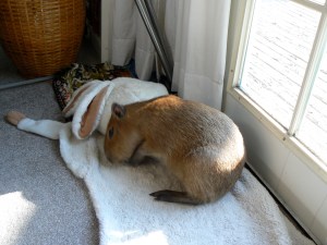 Not long after those photos were taken, Dobby completely lost access to the bedroom. It was December, his outdoor world turned cold and dark, and he took it as a personal affront. I set up an area for him in the kitchen. He and his rabbit moved to the new territory.