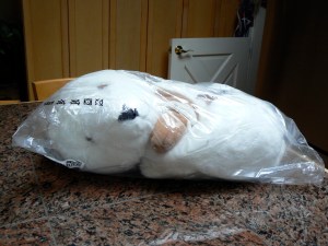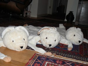 The rabbit head stuffing somehow worked it’s way free and self-distributed as white fuzz throughout his territory. It also decorated the washer and the dryer lint trap turned snowy. The rabbit required frequent laundering, now, and I realized it was time to buy duplicates. I also needed to reserve one for special photo shoots. The rabbit rug was no longer available at IKEA, so I scoured Ebay for “Gosingen.”