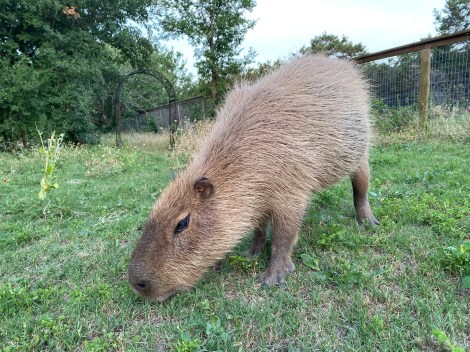 Capybaras need to graze. I can’t say that enough. In the wild, they spend most of their waking hours grazing. Think of them as a tropical deer, or an outsized rabbit. Grass is their primary food. They eat water plants while swimming, and they also browse on shrubbery. The list of wild plants they eat is usually limited to about six plant species. Even so, the greenery they eat supplies them with plentiful Vitamin C which is critical to capybaras. Like humans and guinea pigs, capybaras need supplemental Vitamin C. Lack of Vitamin C can result in scurvy. In capybaras, it often results in malformed bones, and can even cause death.