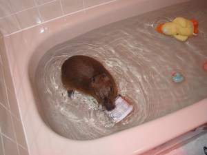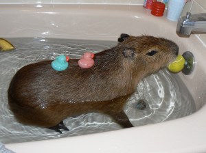 They grow quickly. Dobby outgrew a regular bathtub before he was a year old. Capybara bathing is the only conceivable use for this Jacuzzi tub. I’m joking, of course. I have used this tub to rehabilitate ducks and hens post-surgery, and of course Princess the hen slept on the edge for three years. But I digress.